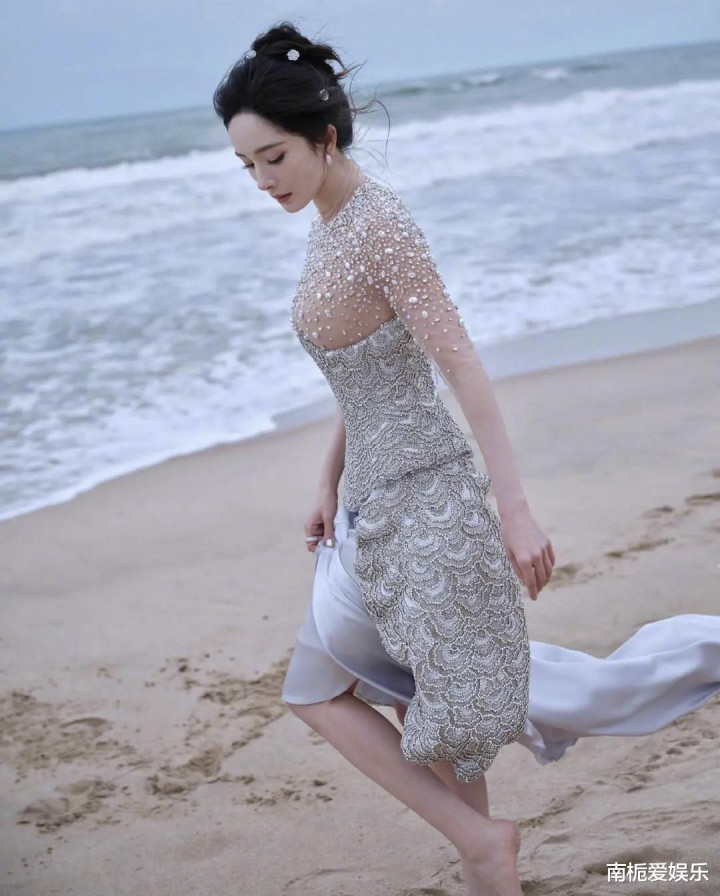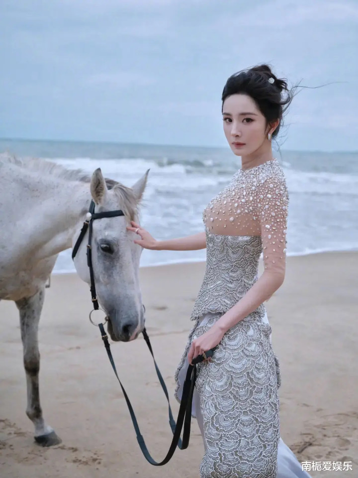 拍摄选址三亚海边,不仅呼应主题,更通过巧妙构图强化“美人鱼上岸”的叙事意境。画面中,杨幂手持贝壳倾听海声,或牵白马缓步前行,背影诗意而孤独。这些充满电影感的场景设计,让整组大片超越传统红毯宣传。她俯身捡拾彩带、贴心提醒工作人员护裙等细节,也在社交媒体广为流传,展现出专业之外的温柔与真实。