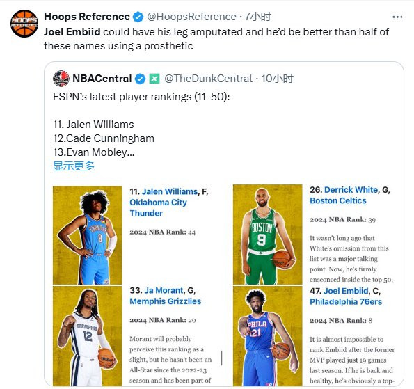 对于恩比德仅排第47名一事,美球迷十分不满并且表示:就算恩比德的一条腿截肢了,装上假肢也照样能打爆名单上一半的人。