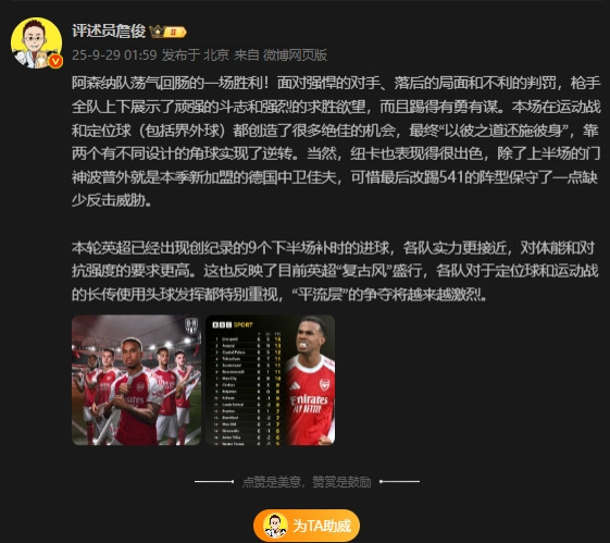 直播吧09月29日讯阿森纳客场2-1逆转绝杀纽卡,赛后著名评述员詹俊先生在社媒发表点评。