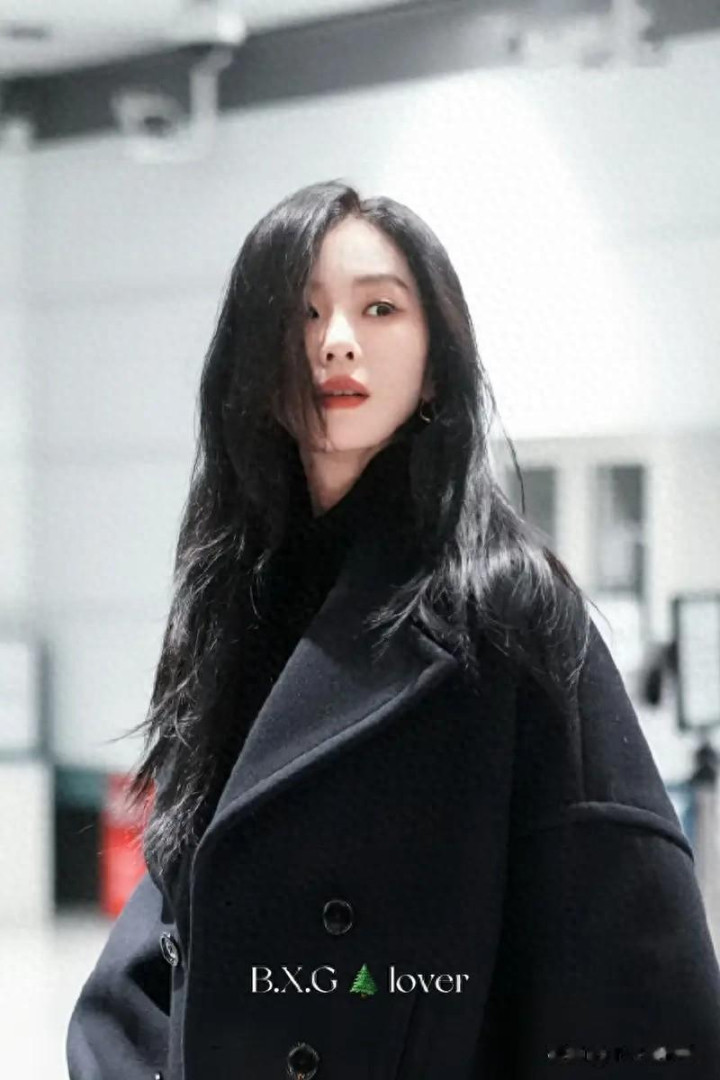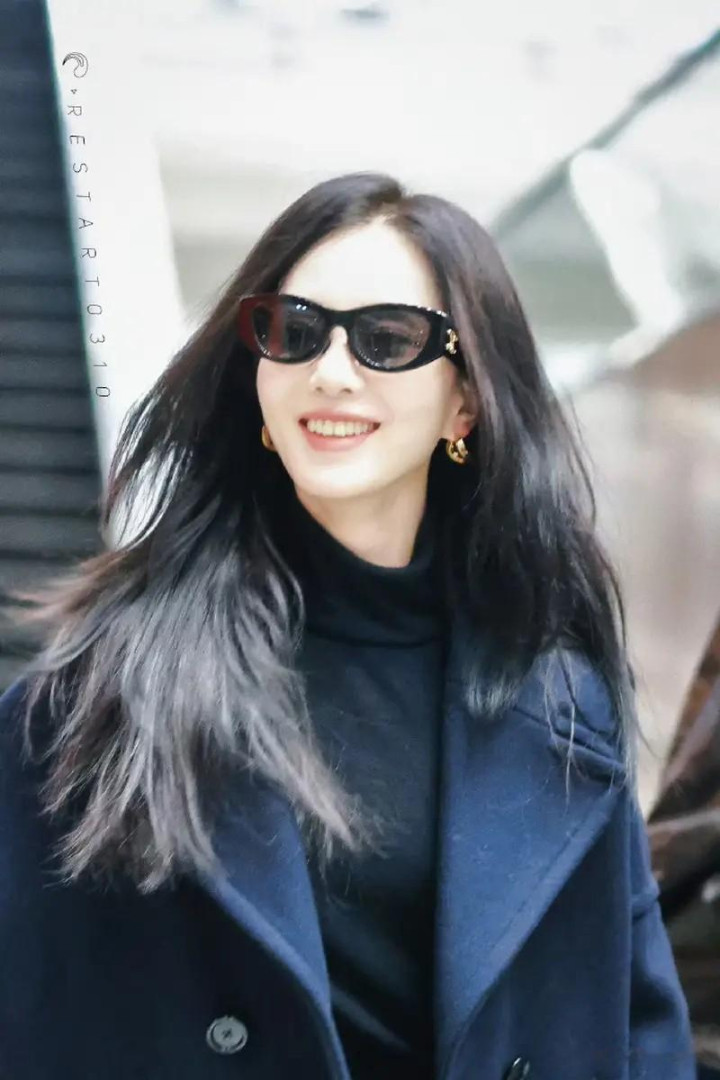 刘诗诗着黑色大衣气质清冷 戴金色耳环笑容灿烂